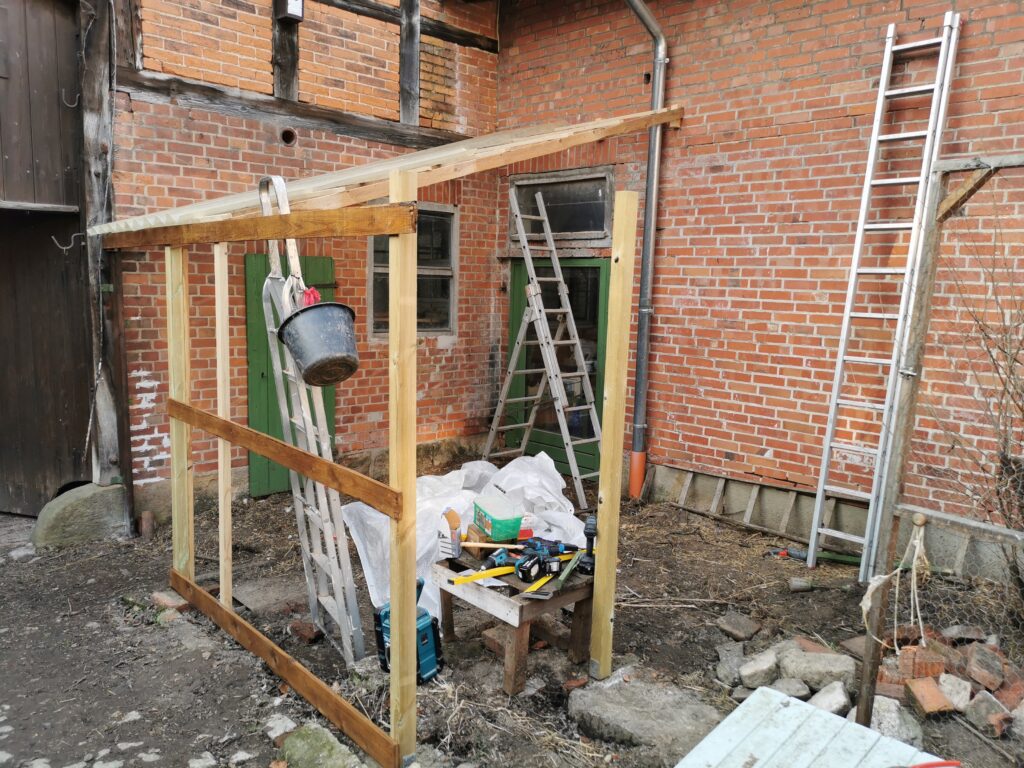 Das neue Außengehege für die Hühner ist schon ganz gut erkennbar. Kerstin arbeitet unermüdlich daran, und gelegentlich kommt jemand zum Helfen vorbei. Ein bisschen wird es aber wohl noch dauern.