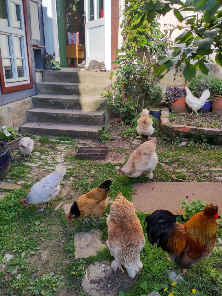 Die Hühner müssen so lange durch die Werkstatt gehen, wenn sie rauswollen – es ist nämlich wegen Vogelgrippe auch noch Stallpflicht, und sie dürfen nur überdacht und spatzensicher nach draußen.